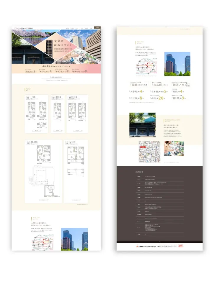 都心への近さと落ち着いた文教地区の環境を両立させたい層に響く構成です。職住近接を重視する共働き世帯や教育環境を大切にするファミリー、医療関係者、歴史・文化と洗練を好む層を想定。周辺環境や生活イメージを矩形グリッドでコラージュし、和の要素を取り入れつつモダンに仕上げています。