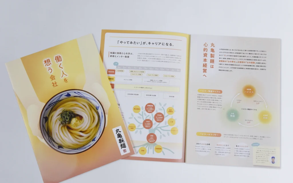 うどんの暖かさ、従業員から幸せが広がっていく様子を 暖かみのあるグラデーションとイラストで表現いたしました。 商品写真とイラストを組み合わせる事でインパクトのあるデザインに仕上げ、 経営思想からインタビューまでをわかりやすくまとめています。 リーフレットを収納するクリアファイルも作成いたしました。